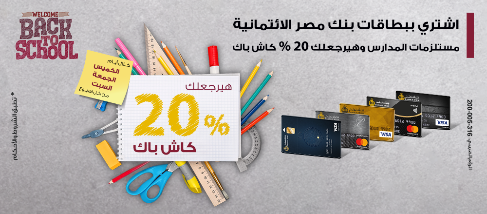 %20 كاش باك في نهاية كل أسبوع على معاملات المشتريات الخاصة بالمكتبات والأدوات الدراسية باستخدام بطاقات بنك مصر الائتمانية