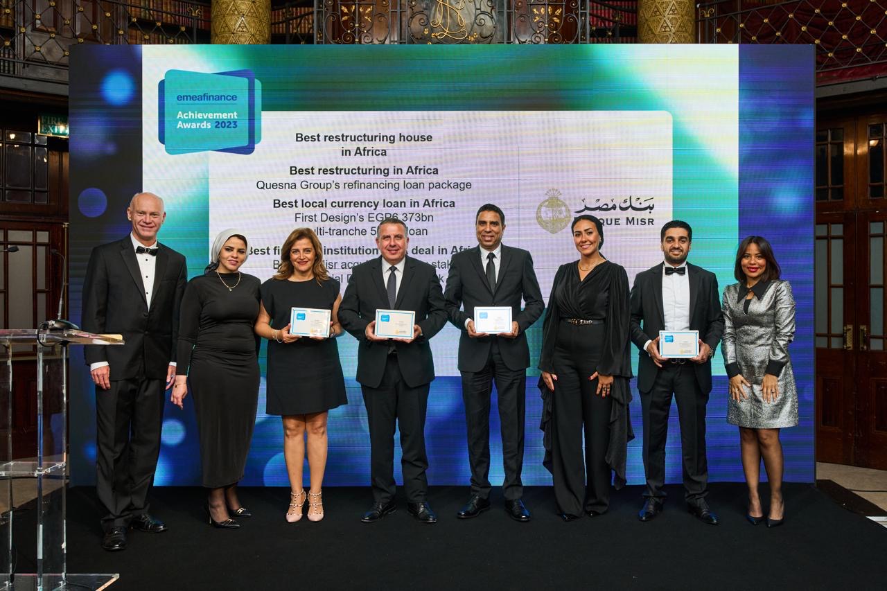 قامت مؤسسة EMEA Finance أحد أهم المؤسسات العالمية في مجال المال والبنوك، بإعلان جوائزها عن عام 2023، في الاحتفال المهيب الذي نظمته مؤسسة EMEA Finance العالمية يومي الأربعاء و الخميس الموافقان 5 و 6 يونيو 2024، بحضور لفيف متميز من قادة القطاع المصرفي ومجتمع الاستثمار حول العالم، وتعتمد التقييمات الخاصة بالفوز لجميع المؤسسات الفائزة على مجموعة من المعايير المتخصصة والمرتبطة بالأداء والاستراتيجية التي تتبناها المؤسسات، فضلاً عن التقييم المستقل لكل عملية تمويلية من قبل لجنة تضم أكبر خبراء الاستثمار حول العالم، وقد قام السيد الأستاذ / محمد خيرت - رئيس قطاع ائتمان الشركات والقروض المشتركة ببنك مصر باستلام الجوائز التي توج بها البنك بحضور مجموعة من فرق العمل ببنك مصر، حيث حصد بنك مصر جائزة "أفضل بنك لترتيب عمليات إعادة هيكلة في إفريقيا لعام 2023"، و"أفضل عملية إعادة هيكلة بإفريقيا"، و"أفضل تمويل بالعملة المحلية بإفريقيا"، و"أفضل عملية تمويل مشترك بإفريقيا"، و"أفضل عملية تمويل مشترك بشمال إفريقيا"، و"أفضل عملية تمويل مشترك لهيئات في أوروبا والشرق الأوسط وإفريقيا"، كما حصل على عدة جوائز كأفضل عمليات تمويلية في مصر وهى: "أفضل عملية تمويلية عن مشروع ترفيهي" ، و"أفضل عملية تمويلية في مجال صناعة البتروكيمياويات"، و"أفضل عملية تمويلية في قطاع الاستثمار العقاري"، و"أفضل عملية تمويلية في قطاع السياحة"، و"أفضل عملية تمويلية في قطاع البنية التحتية" ، و"أفضل عملية تمويلية في قطاع العقارات" و"أفضل صفقة استحواذ مؤسسات مالية بإفريقيا".