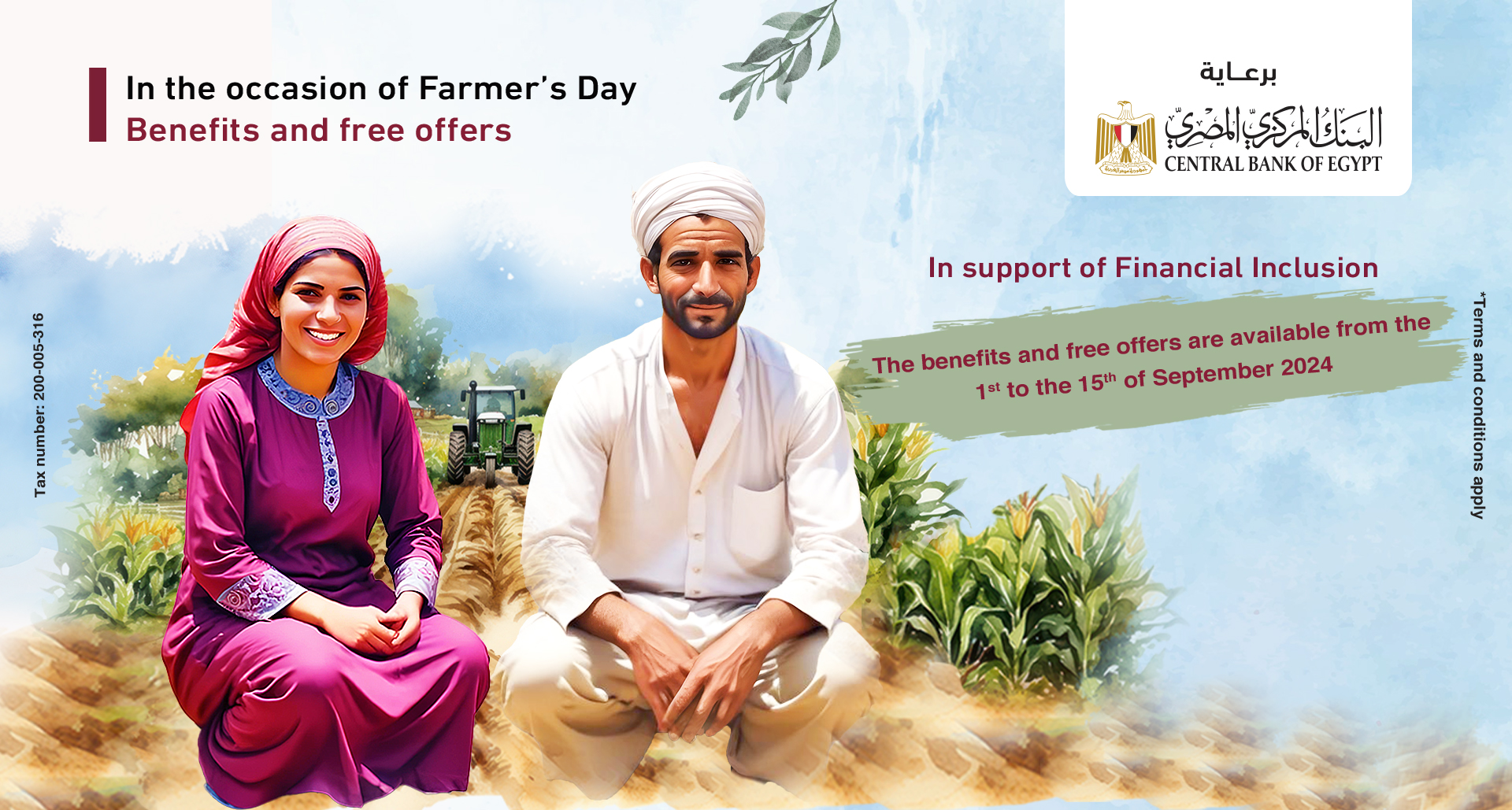 Throughout the event, which runs from September 1st to 15th, 2024, the bank is keen to provide numerous free benefits and offers to serve all customer segments, especially women, youth, people with disabilities, and farmers. Bank Misr offers various financial products and services with free benefits and offers during the "Farmer's Day" event. These include opening new accounts for customers with no fees or minimum balance requirements, issuing prepaid Visa cards without issuance fees, and the option to open an "Al Munjaz" economic activity account, either current or debt, with exemption from account opening fees and minimum balance requirements. Visa debit cards relevant to "Munjaz" economic activity accounts are also exempt from issuance fees. Additionally, BM Wallet subscribers will receive a 20% cashback on their first transaction during the celebration day subject to terms and conditions.