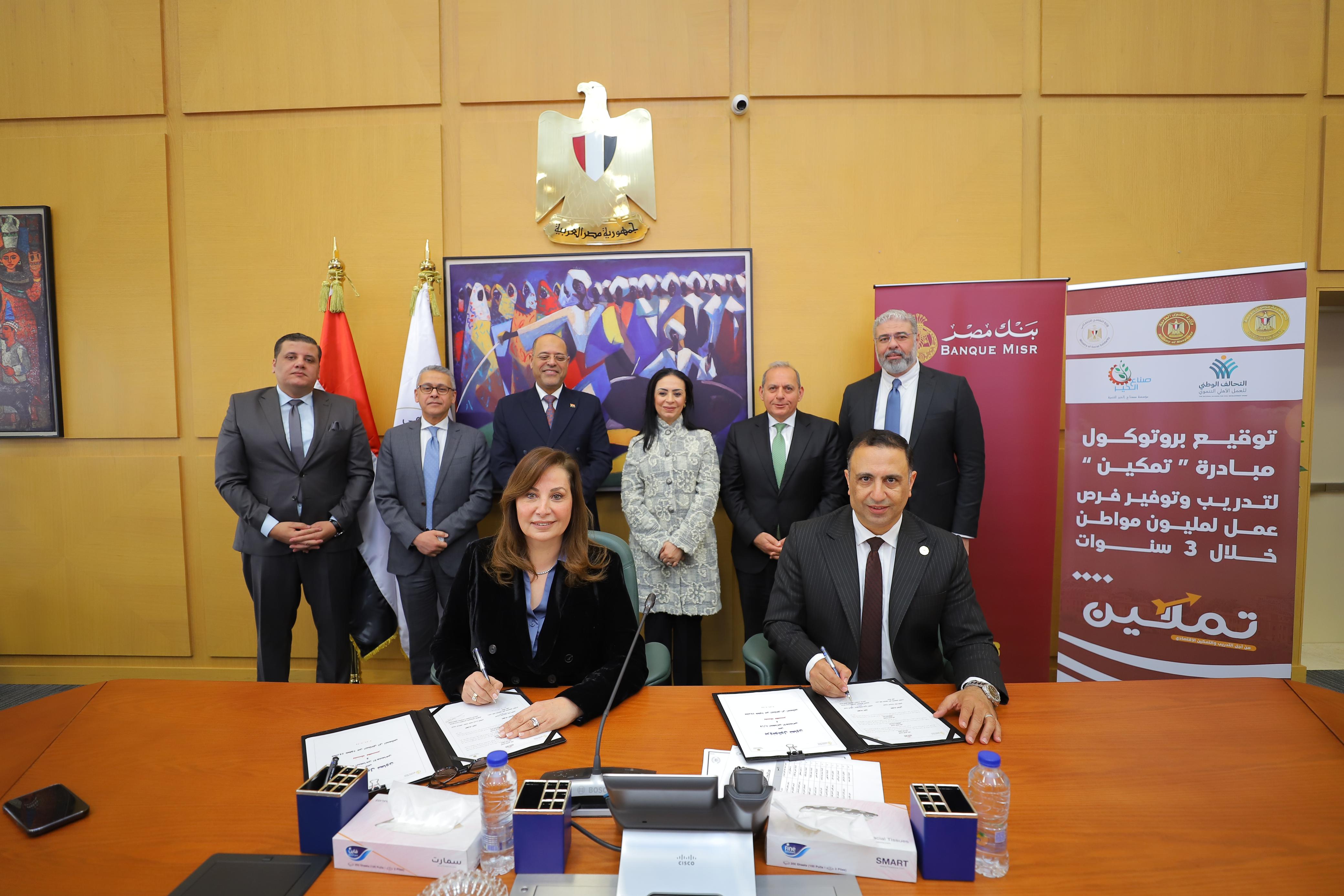 شهد كلا من السيدة الدكتورة / مايا مرسى وزيرة التضامن الاجتماعي، والسيد الأستاذ /محمد جبران - وزير العمل، وبحضور السيد الأستاذ / هشام عكاشه - الرئيس التنفيذي لبنك مصر، والسيد الأستاذ / حسام الدين عبد الوهاب - نائب الرئيس التنفيذي لبنك مصر توقيع البنك لبروتوكولي تعاون مع كلا من وزارة التضامن الاجتماعي ومؤسسة صناع الخير للتنمية عضو التحالف الوطني للعمل الأهلي التنموي ، حيث قامت الأستاذة /هند فهمى - رئيس قطاع الشمول المالي والتمويل العقاري ببنك مصر بتوقيع بروتوكولي التعاون مع كلا من الدكتور/محمد العقبى مساعد وزير التضامن الاجتماعي للتخطيط الاستراتيجي ، والدكتور / مصطفى زمزم رئيس مجلس أمناء مؤسسة صناع الخير، وقد حضر التوقيع لفيف متميز من قيادات بنك مصر و وزارة التضامن الاجتماعي ومؤسسة صناع الخير.