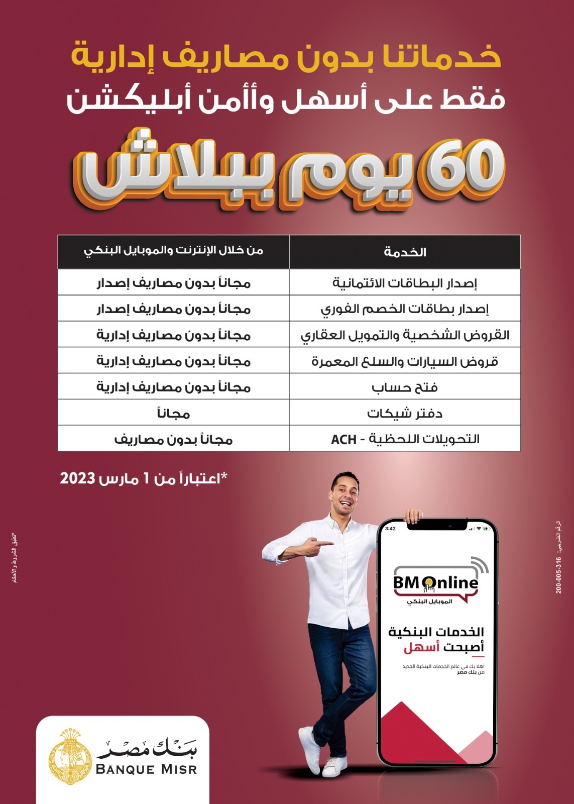 خدماتنا بدون مصاريف إدارية لمدة 60 يوم من خلال خدمة الانترنت والموبايل البنكى BM Online