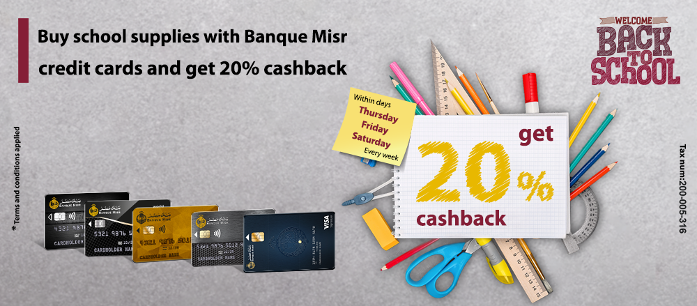 20% cashback by the end of week by using Banque Misr credit cards in purchasing school supplies