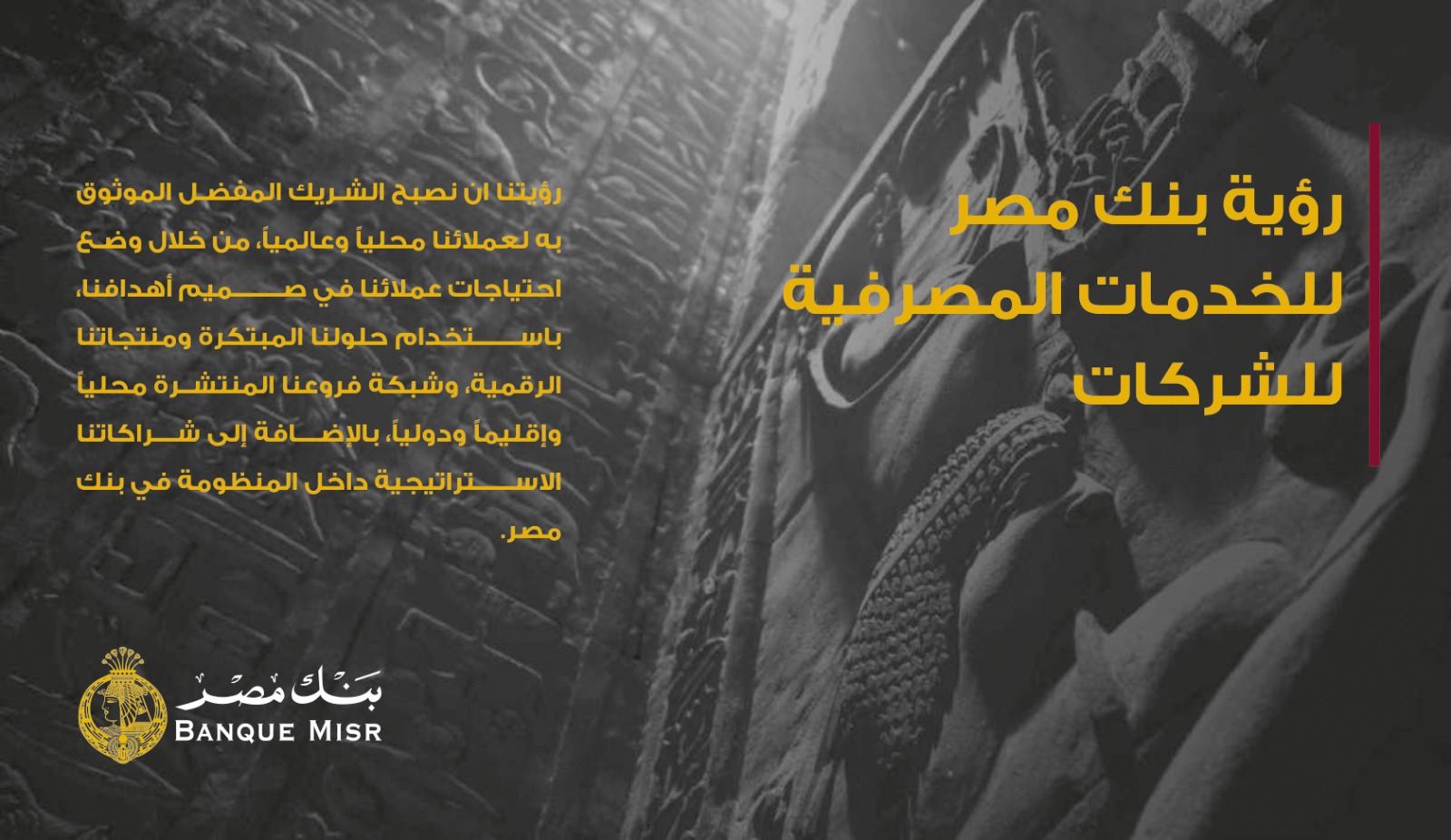 رؤيتنا ان نصبح الشريك المفضل الموثوق به لعملائنا محلياً وعالمياً. من خلال وضع احتياجات عملائنا في صميم أهدافنا، باستخدام حلولنا المبتكرة ومنتجاتنا الرقمية، وشبكة فروعنا المنتشرة محلياً وإقليمياً ودولياً، بالإضافة إلى شراكاتنا الاستراتيجية داخل المنظومة في بنك مصر.