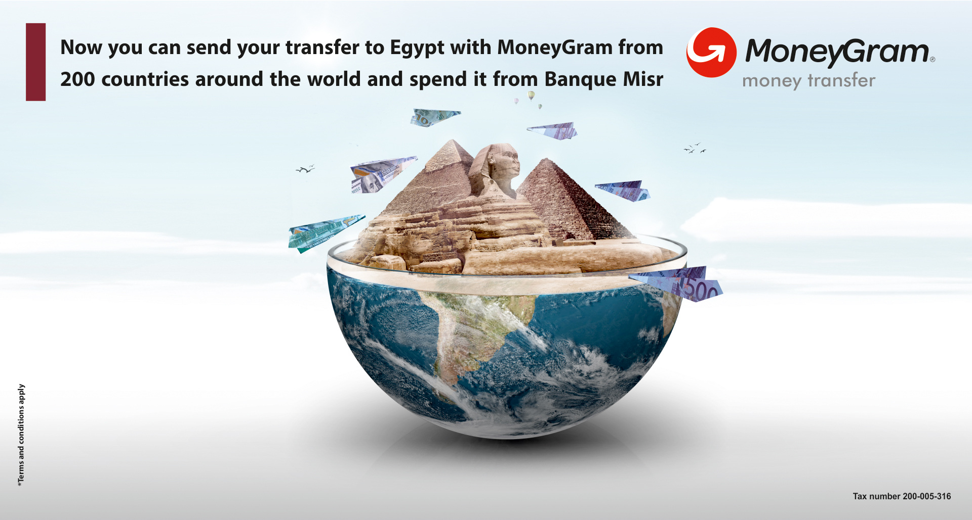 Now you can send your money transfer to Egypt through Money Gram from 200 countries around the world, and you can cash it from 165 Banque Misr branches that are spread all over the Republic.