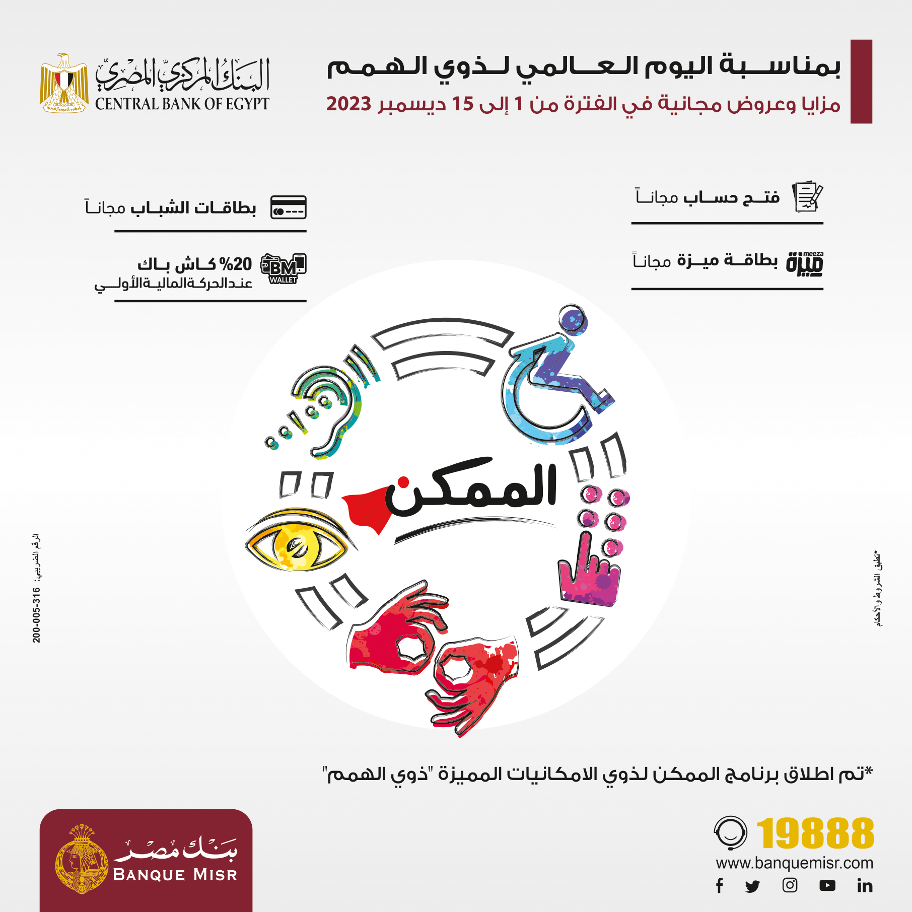 بنك مصر يقدم باقة من المزايا والعروض المجانية بمناسبة "اليوم العالمي لذوي الهمم" تعزيزاً للشمول المالي برعاية البنك المركزي المصري