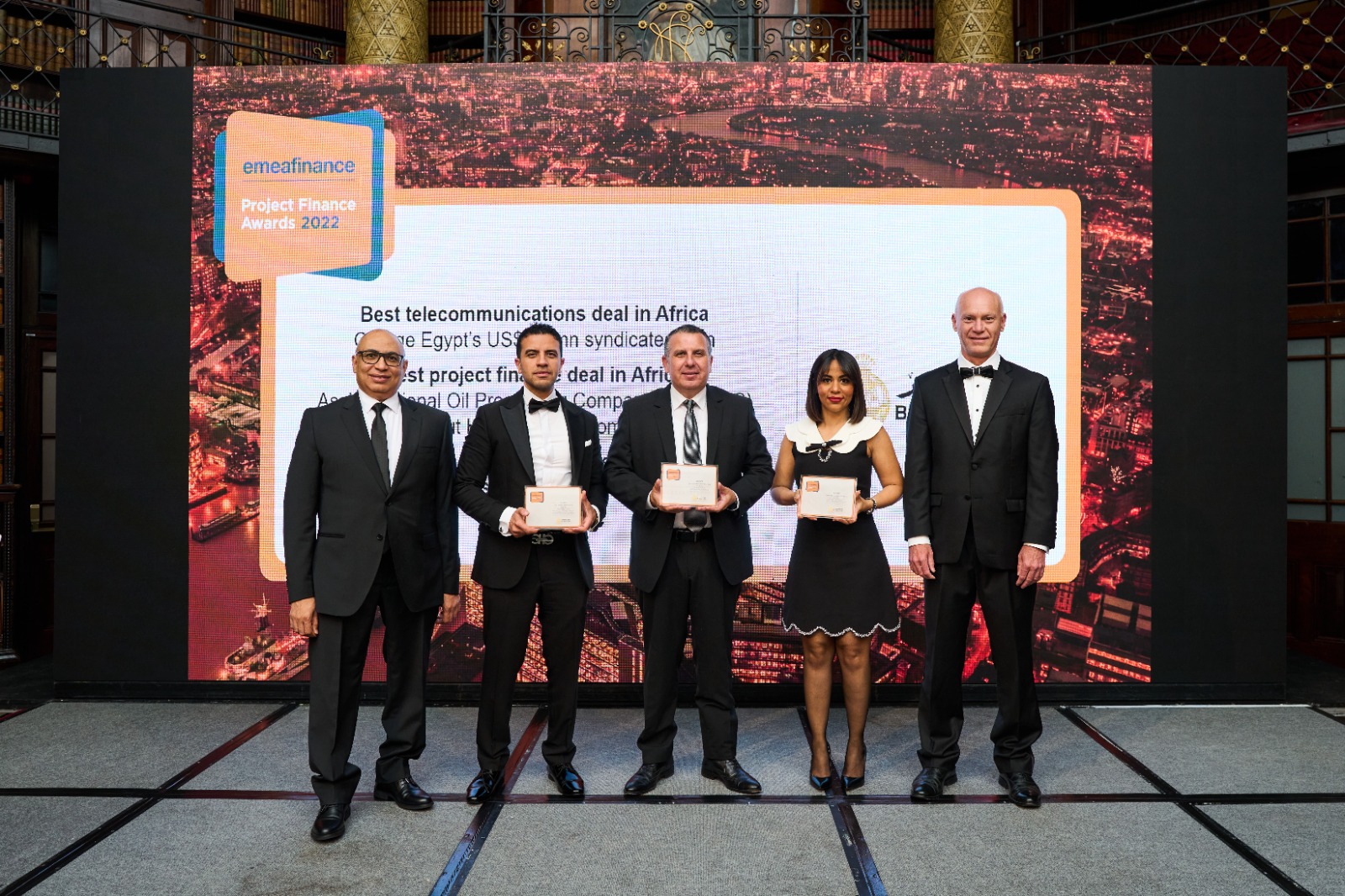 The awards were received by Mr. Mohamed Khairat, Head of the Corporate Credit and Syndications Sector, along with a group of sector team members, during a prestigious ceremony organized by EMEA Finance. The event was attended by a distinguished group of leaders from banks that received awards.